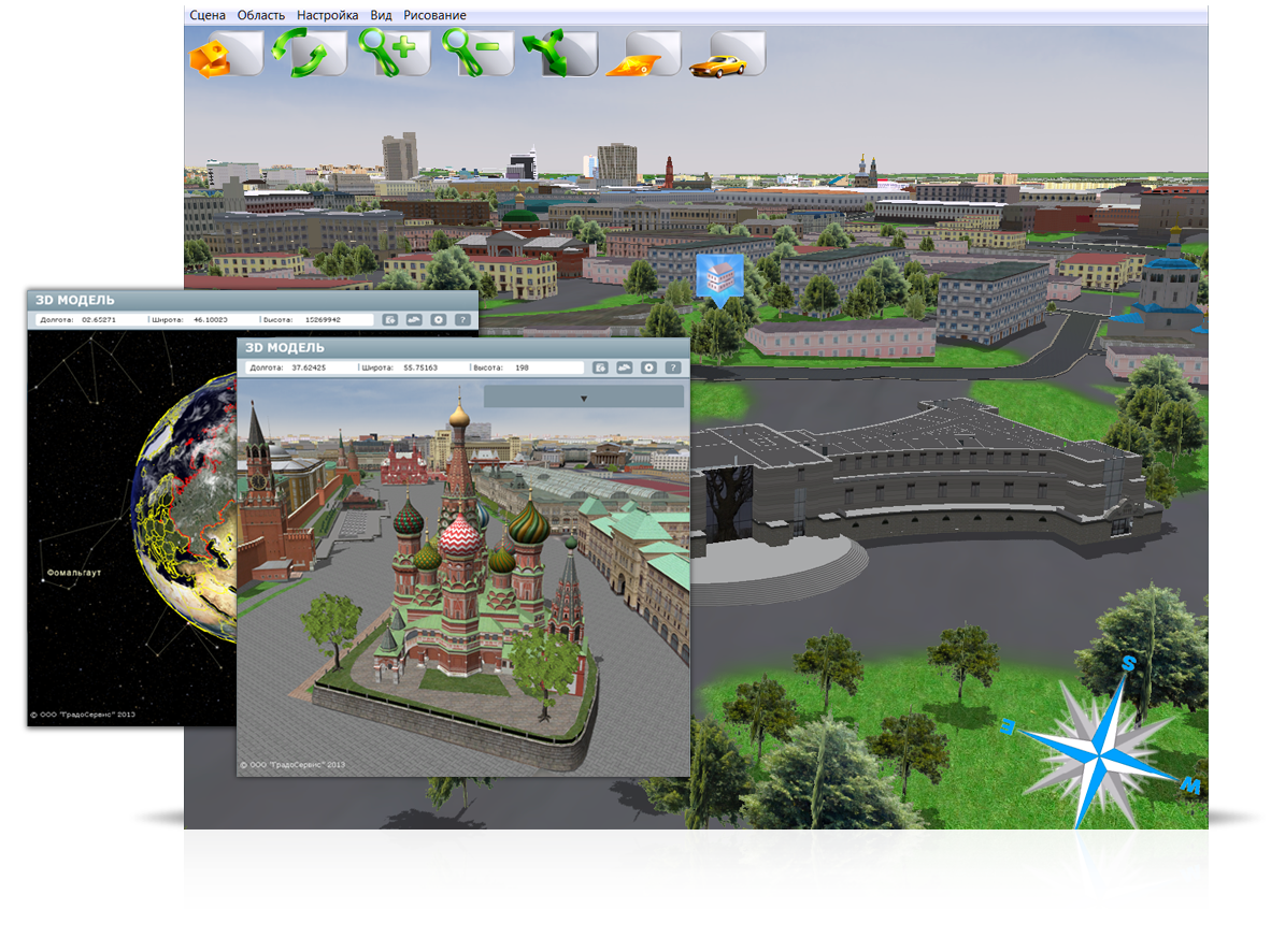 Моделирование различных ситуаций в трехмерном пространстве: смена дня и ночи, развитие территории вследствие строительства сооружений, динамика природных и техногенных процессов на базе данных геоинформационных систем.